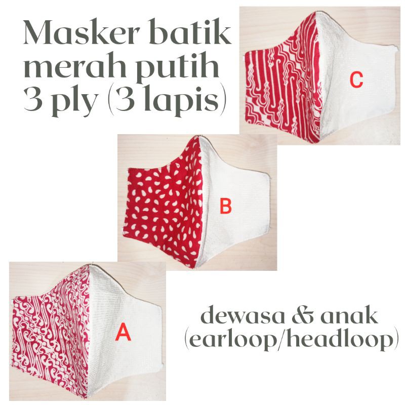 masker kain batik cap dan batik dolbi merah putih 3 lapis, karet earloop / headloop, size dewasa dan